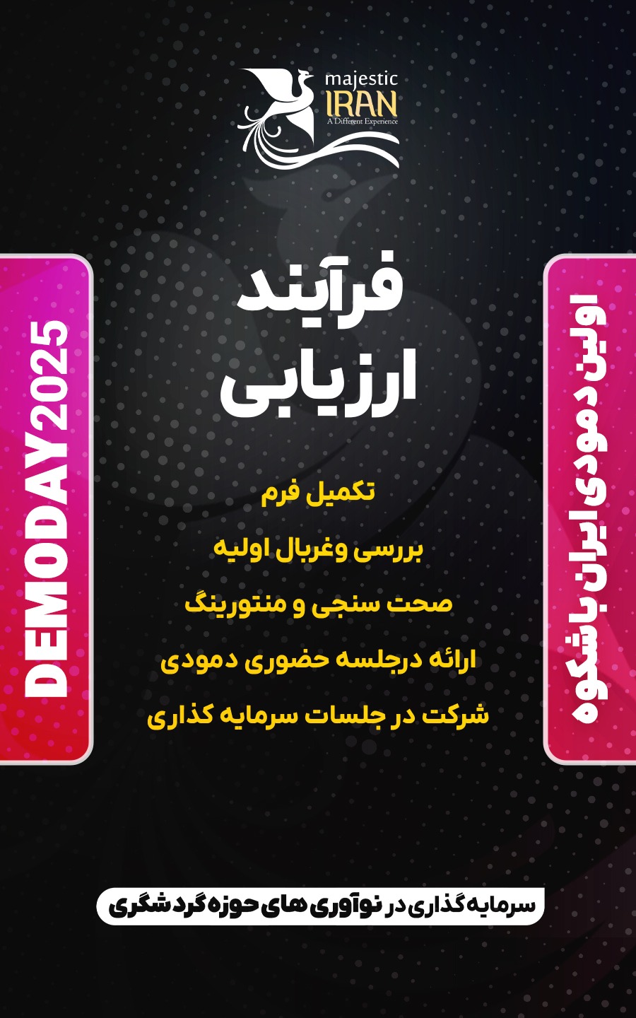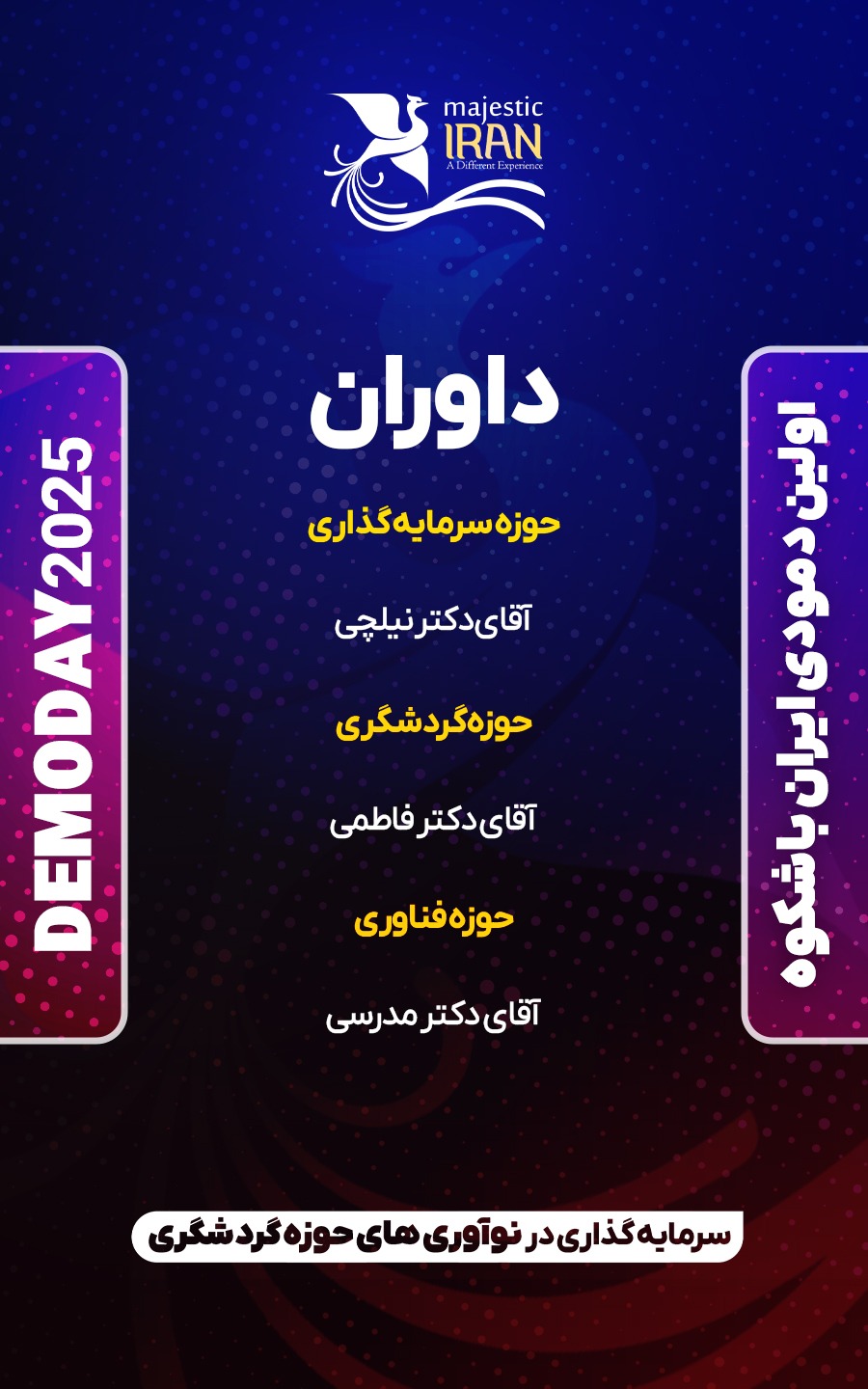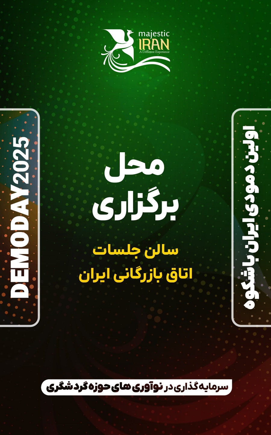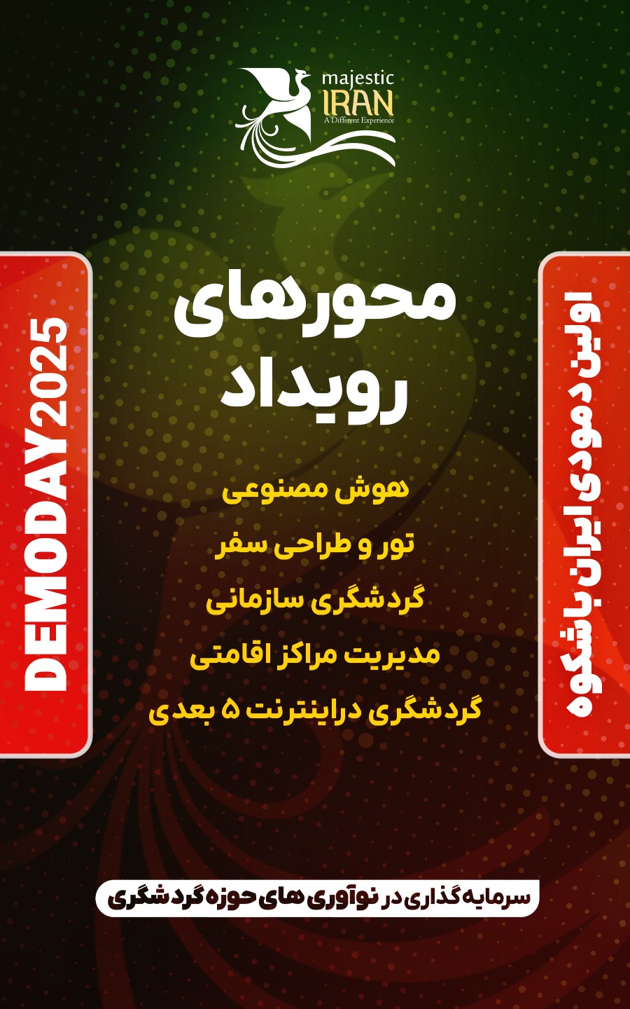 برای ثبت نام در اولین دمودی ایران باشکوه به منظور سرمایه‌گذاری در نوآوری‌های حوزه گردشگری در محورهای گردشگری سازمانی، رزرواسیون، مدیریت مراکز اقامتی، تور و طراحی سفر، گردشگری در اینترنت 5 بعدی و هوش مصنوعی که توسط مهر سیاحت سبا – شرکت گردشگری بیمه ایران – زیر نظر هلدینگ توسعه کسب و کار سبا (سرمایه‌گذاری بیمه ایران) با همکاری وزارت میراث فرهنگی، گردشگری و صنایع دستی ‌و کمیسیون گردشگری اتاق بازرگانی ایران برگزار میگردد. اطلاعات خود را از طریق فرم زیر حداکثر تا تاریخ ۳۱ شهریور ۱۴۰۴ به دبیرخانه رویداد ارسال فرمایید.